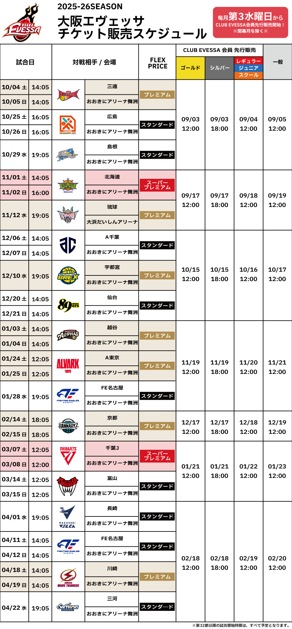 スタンダード・プレミアム価格対象試合は「8枚」、スーパープレミアム価格対象試合は「4枚」まで、CLUB EVESSA会員価格でご購入いただけます。