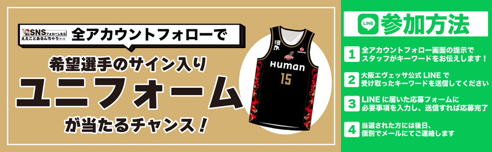 昨シーズンご好評いただいた「SNSフォローしたら、ええことあるんちゃう?」ブースを、2025-26シーズンもホームゲーム会場にて開催することが決定しました。会場のブースにて大阪エヴェッサ公式SNSのフォロー画面をスタッフにご提示いただくと、フォローコンテンツ数に応じた豪華景品をプレゼントします。