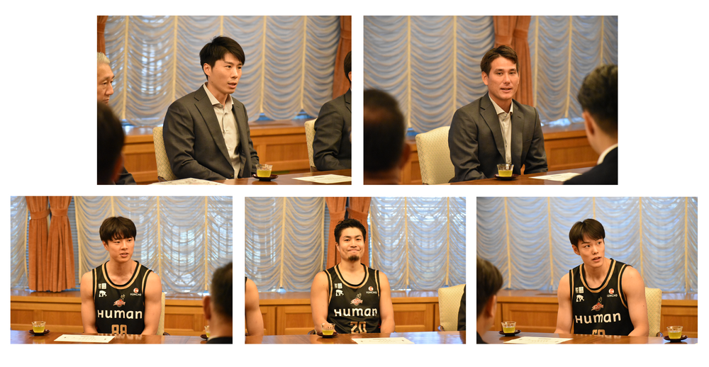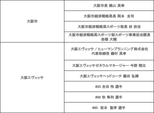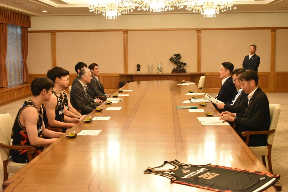 横山市長からは、「いよいよ、Bリーグの10年目のシーズンが開幕します。開幕前に、市役所に来ていただき、皆さんを激励できることは大阪市民を代表して非常にうれしく思います。昨シーズンは、西地区4位でチャンピオンシップへの進出はかないませんでしたが、今シーズンはぜひともチャンピオンシップ進出を目指して戦っていただきたいと思っております。私も、大阪エヴェッサの熱心なブースターの皆さんとともに、大阪エヴェッサの快進撃を見せていただけることを期待しています。なお、10月4日(土)の開幕戦には、激励にお伺いさせていただきます。また、大阪エヴェッサの皆さんには、日頃から小中学生への招待事業など地域貢献にご尽力をいただき、改めて感謝申し上げます。」とお言葉をいただきました。