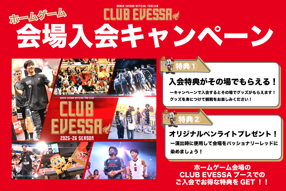 大阪エヴェッサ公式ファンクラブ「CLUB EVESSA」では、ホームゲーム会場のCLUB EVESSAブースでご入会いただいた方を対象に、入会キャンペーンを実施します。