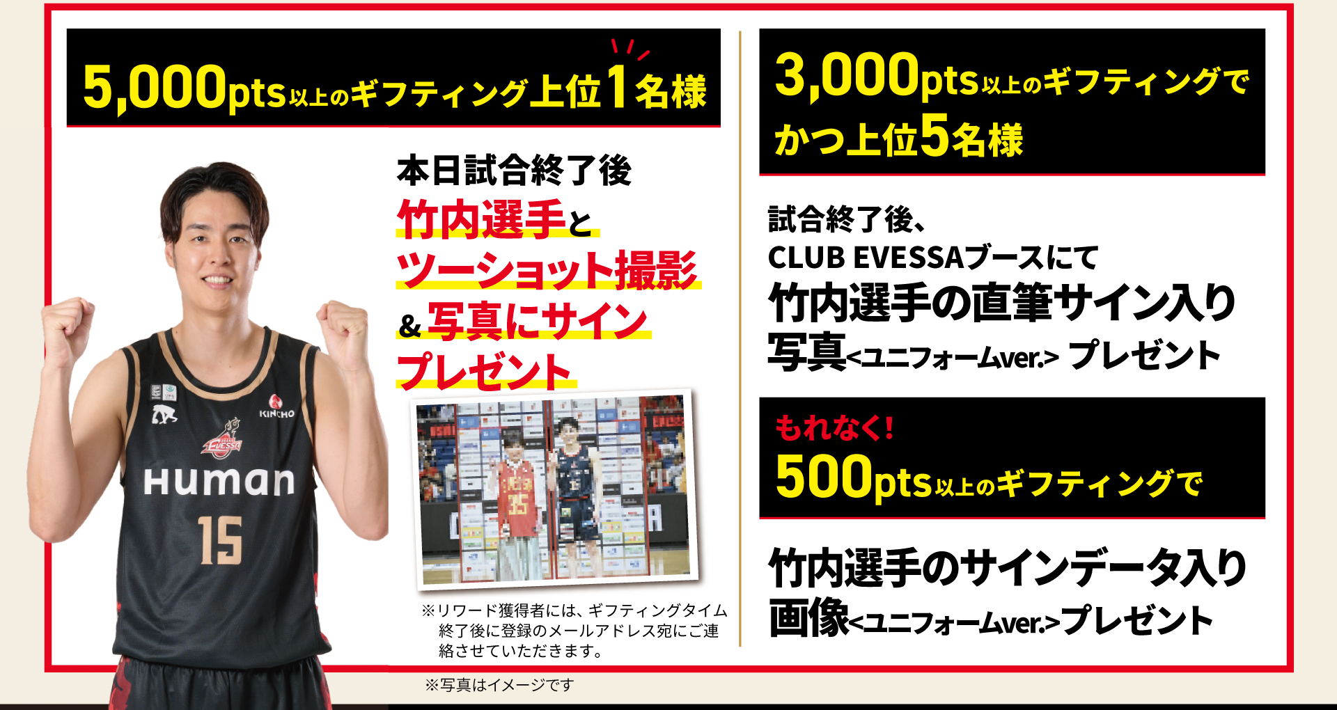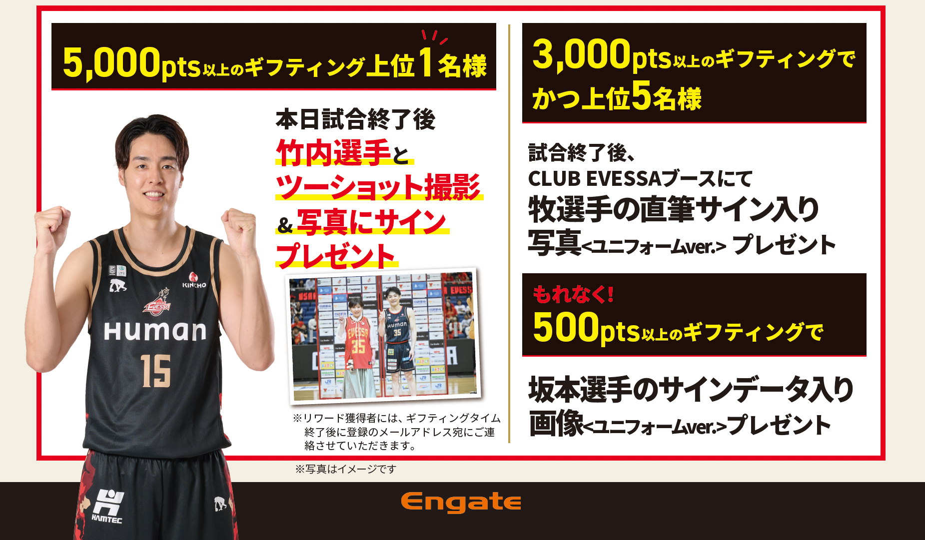 ①5,000PTS相当以上のデジタルギフトをギフティングいただいた方の中から「上位1名さま」へ【11月2日(日)試合後のセレモニーにて、竹内 譲次選手と2ショット撮影&直筆サイン入り2ショット写真プレゼント】