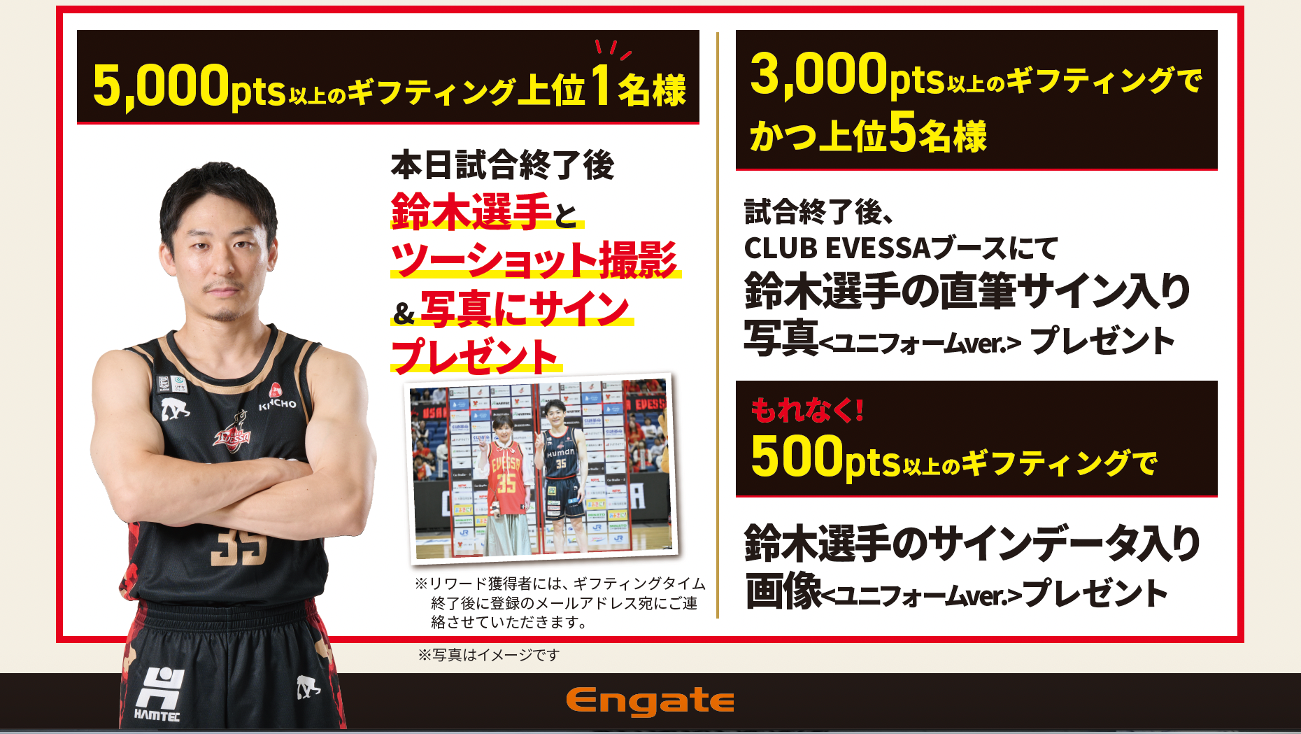 ③試合開始前とハーフタイムに「Engate Gifting Time」がスタートします。ご自身のスマホから大阪エヴェッサの選手やチームに応援(ギフト)を贈ろう!