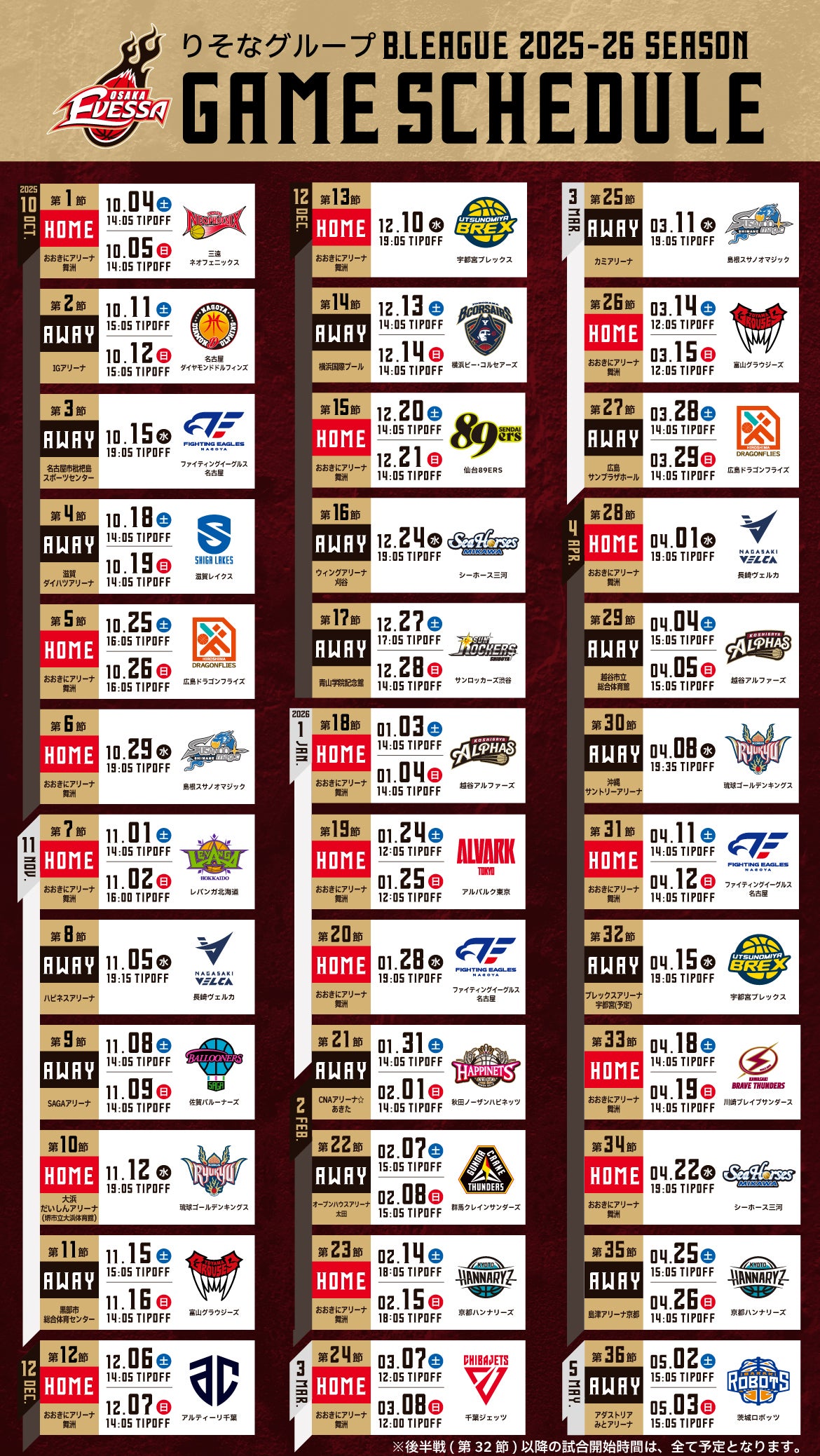 このたび、りそなグループ B.LEAGUE 2025-26シーズンの後半戦(19節~31節)の試合開始時間が決定しましたので、お知らせします。