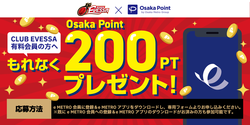e METRO会員に登録&e METROアプリのダウンロードを行い、専用フォームよりお申込みいただいた方へ、後日Osaka Point 200ptを進呈します!