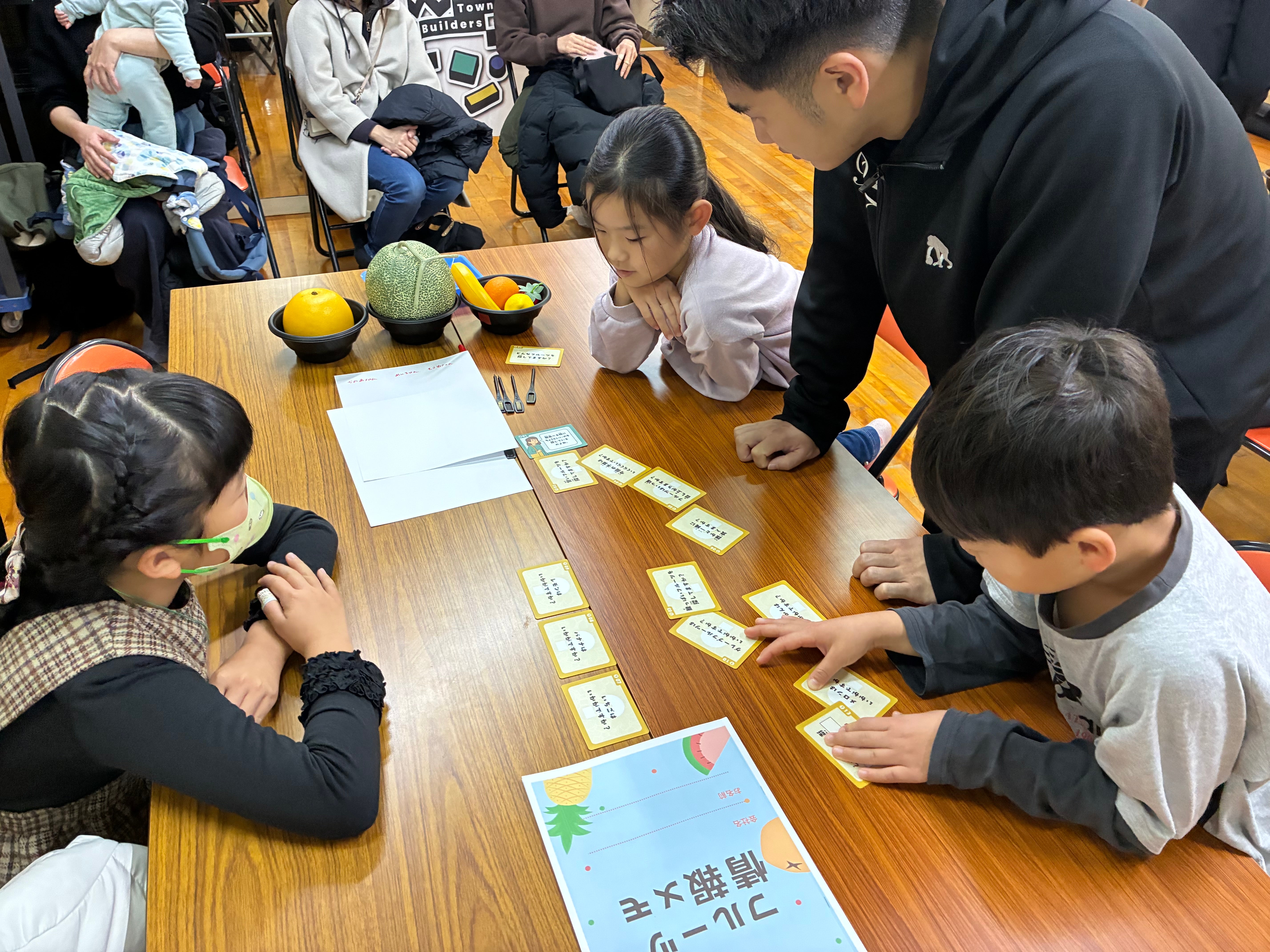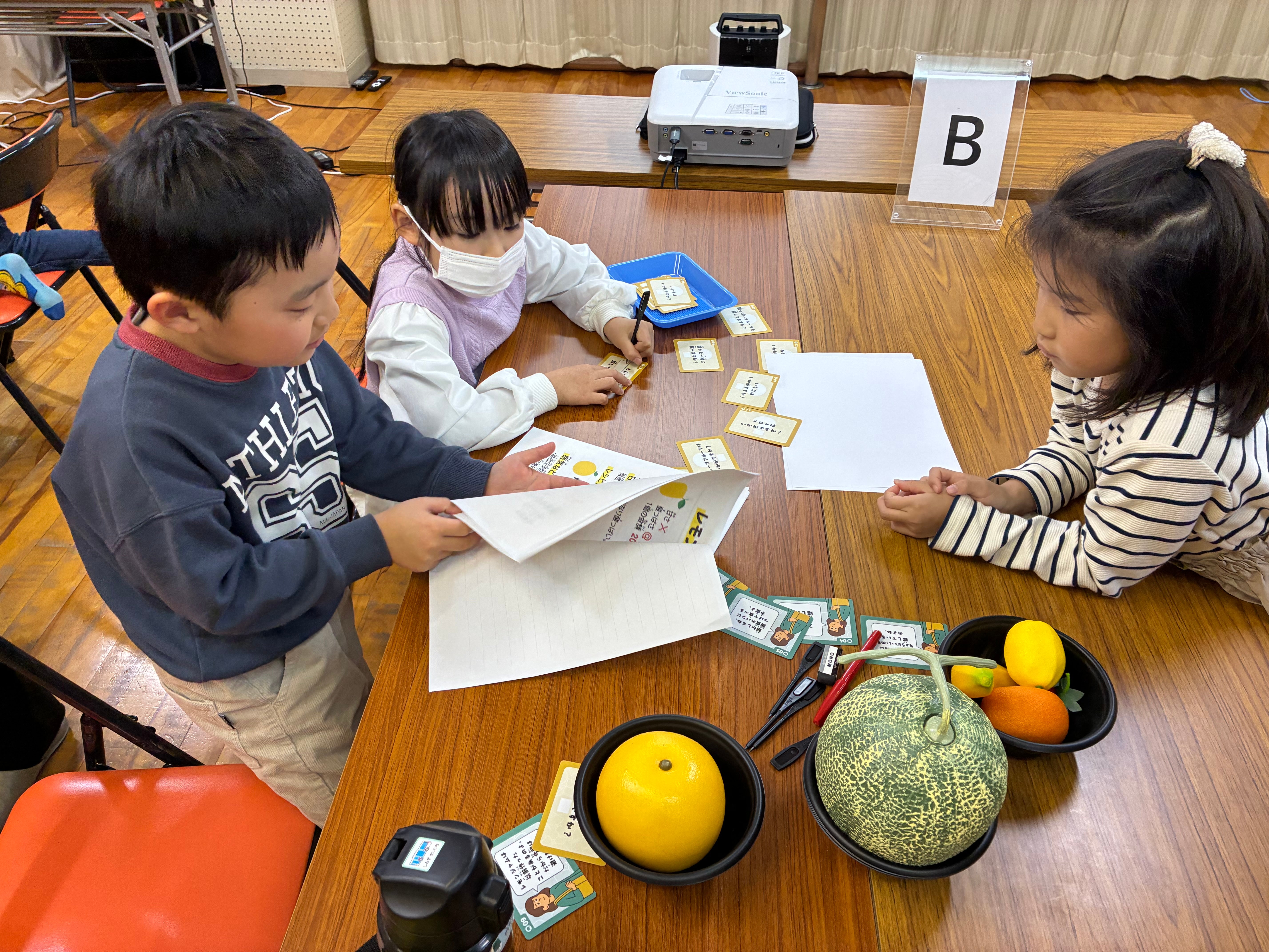 フルーツを買いに来たお客さまが、どのフルーツを求めているのかを、お客様から情報を聞き出し予測するゲームを、チームに分かれて行いました。