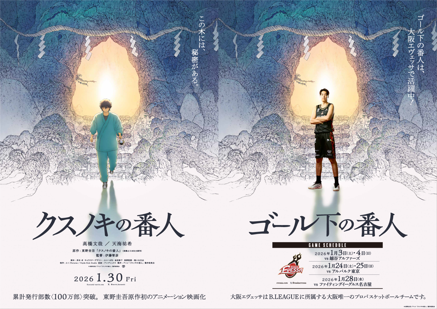 映画『クスノキの番人』と、大阪エヴェッサのコラボポスターを1月のホームゲーム3節5試合の会場内に掲出予定です。