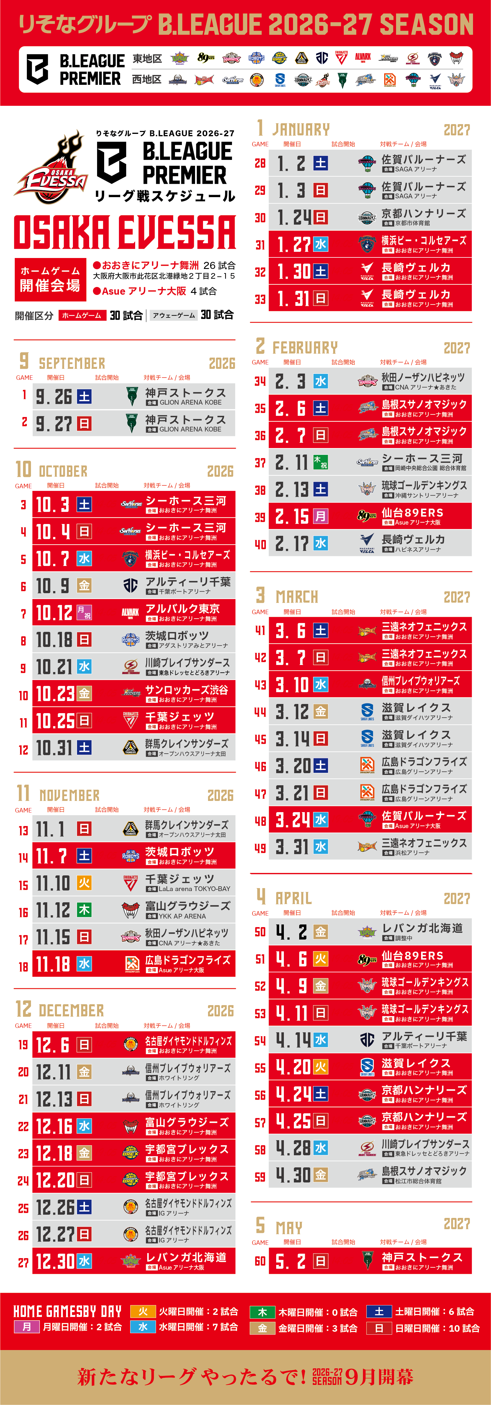 このたび、B革新初年度となる「りそなグループ B.LEAGUE 2026-27 SEASON」のカーディング(日程、対戦カードおよび会場)が決定しましたので、お知らせします。