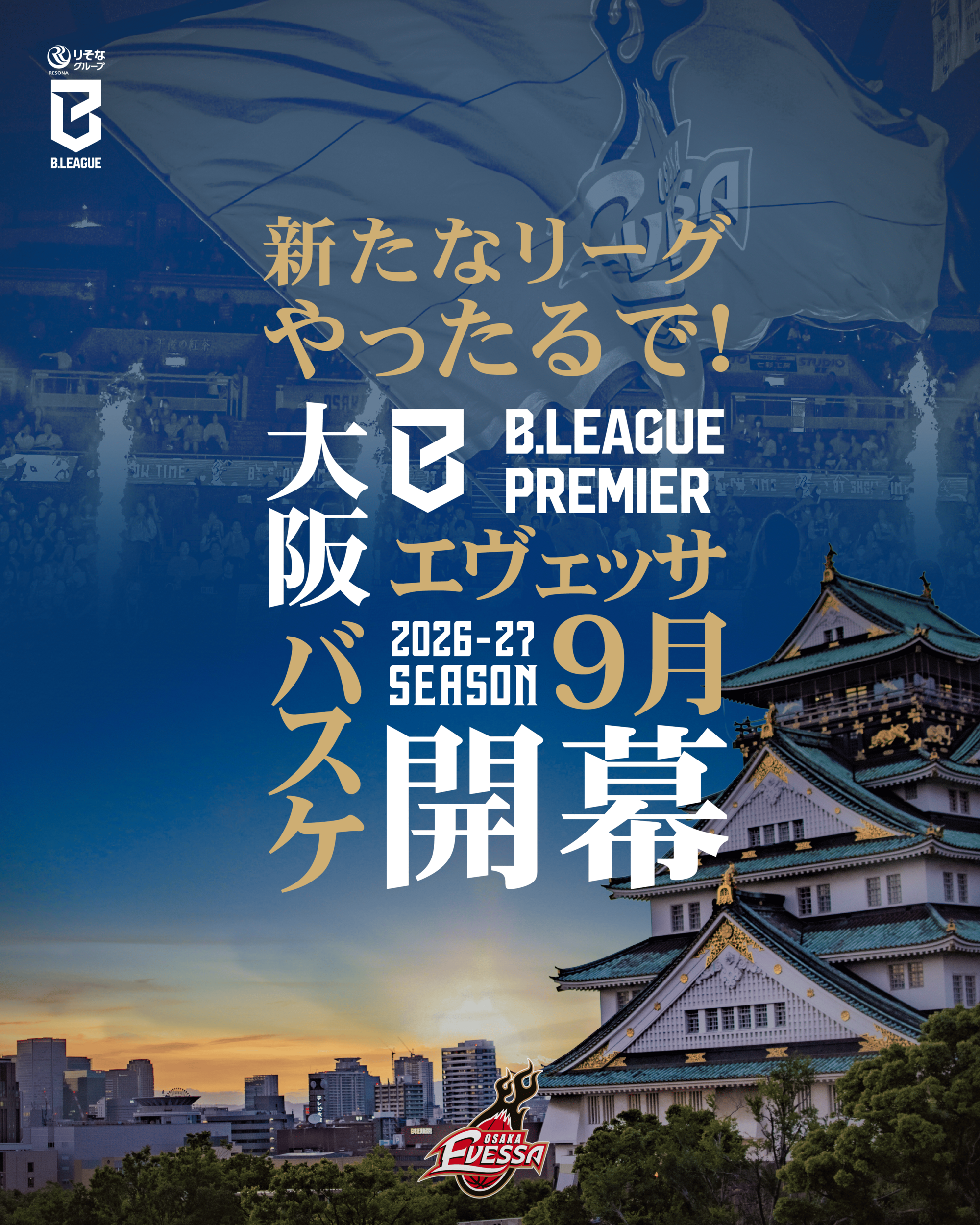 大阪エヴェッサのホーム開幕戦は、2026年10月3日(土)。おおきにアリーナ舞洲にてシーホース三河を迎え、新たな一歩を踏み出します。