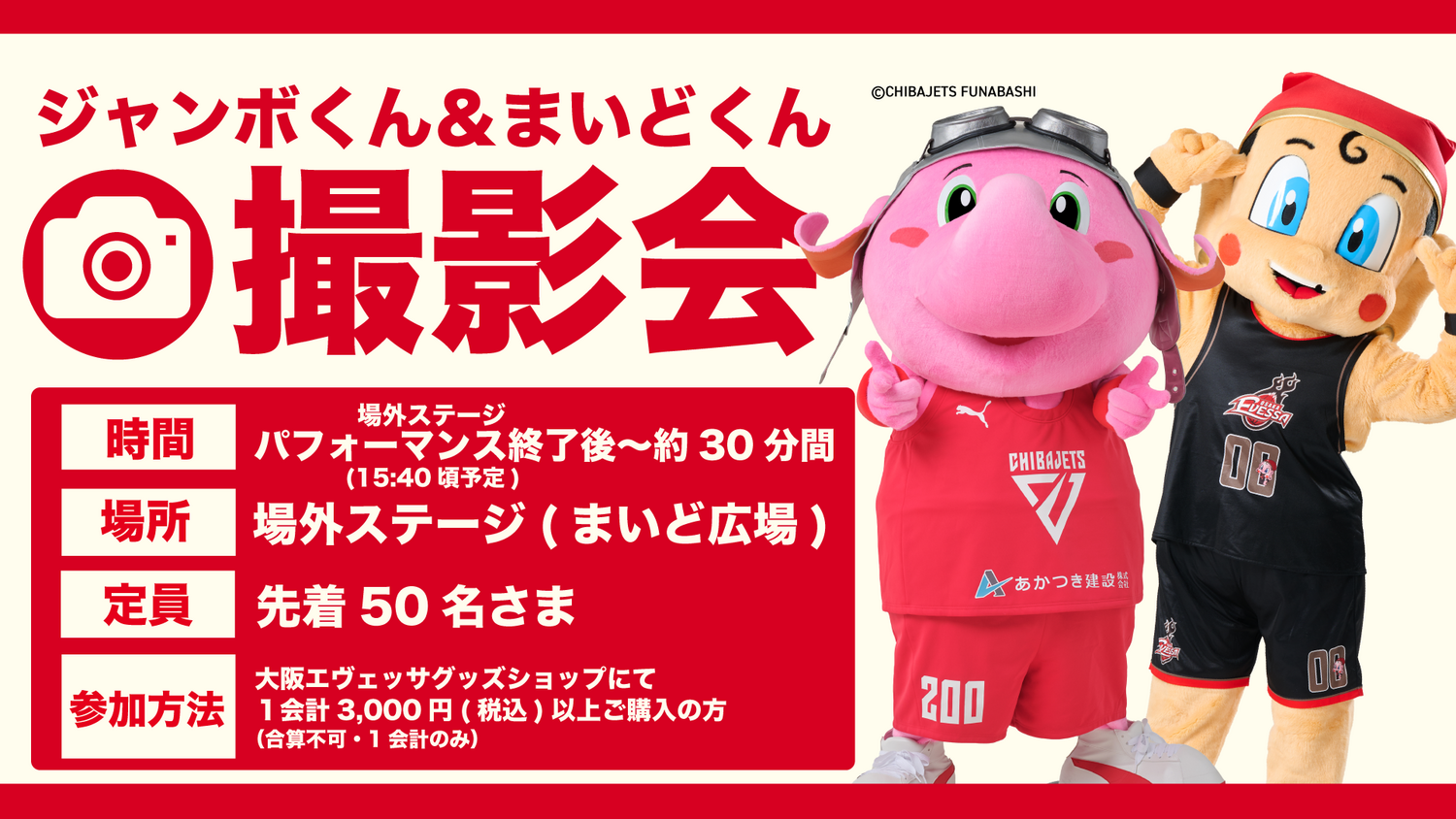 グッズを3,000円(税込)以上ご購入の先着50名さまは、ジャンボくん、まいどくんとの3ショット撮影にご参加いただけます!