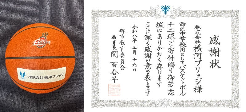 このたび、株式会社横河ブリッジさまのご協力のもと、堺市西区の中学校6校(浜寺中学校、上野芝中学校、福泉中学校、鳳中学校、津久野中学校、浜寺南中学校)へバスケットボール12球を寄贈しました。