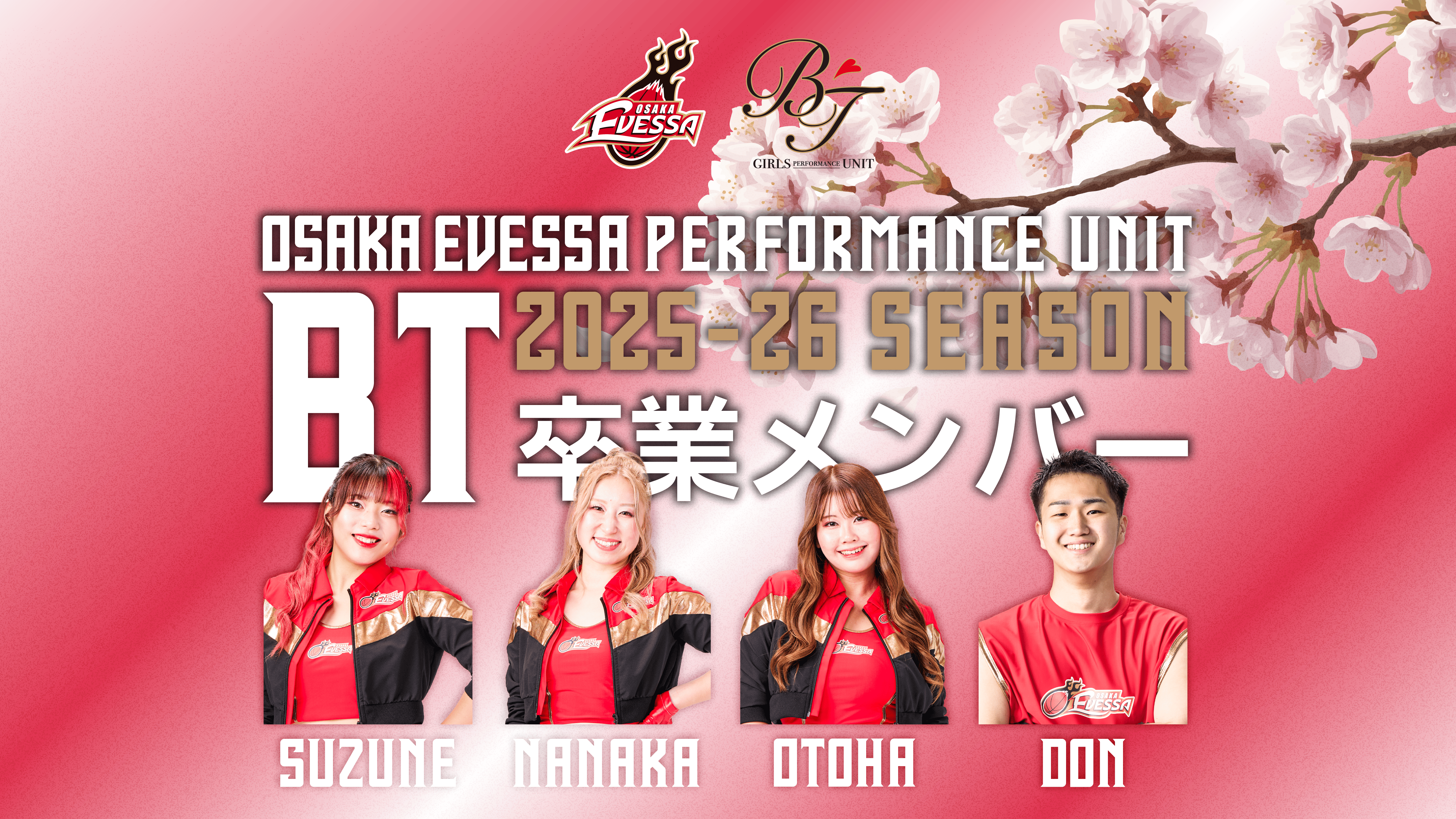 このたび、大阪エヴェッサ公式パフォーマンスユニット「BT」のSUZUNE・NANAKA・OTOHA・DONの4名が、2025-26シーズンをもって卒業することとなりました。