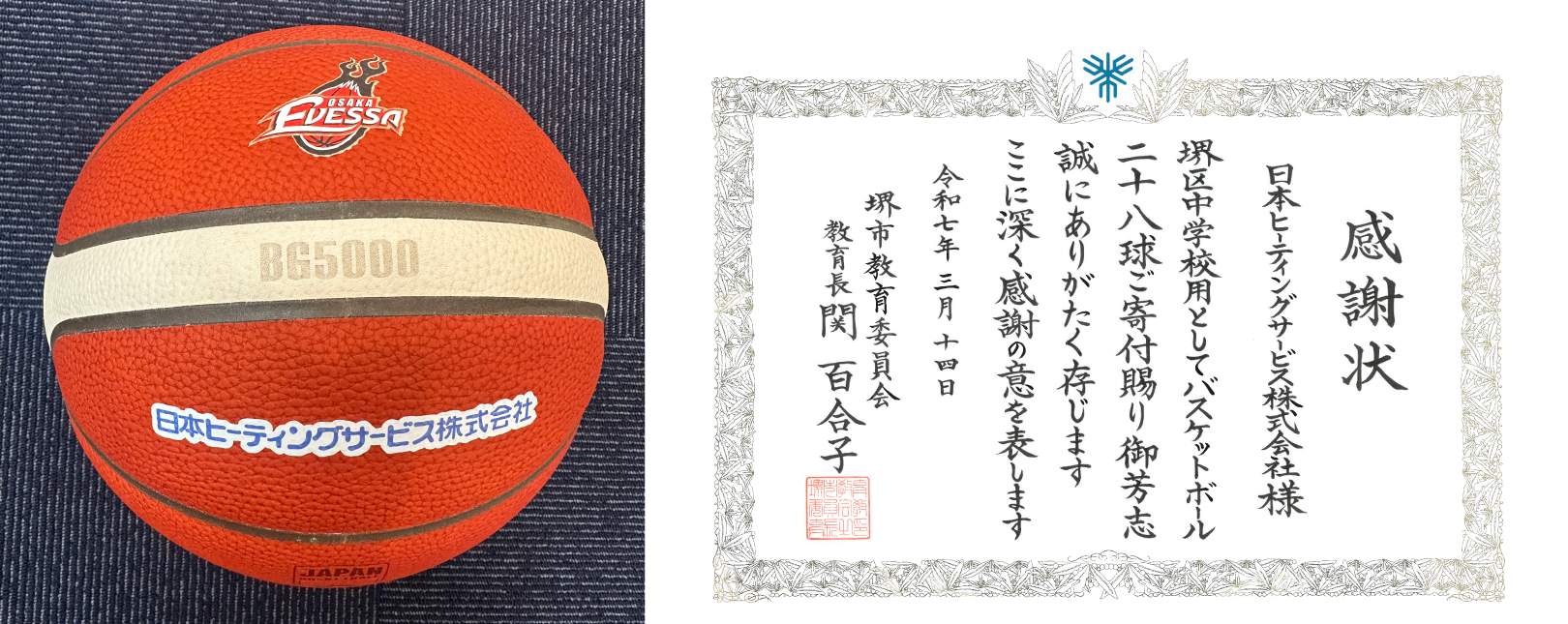 このたび、日本ヒーティングサービス株式会社さまのご協力のもと、堺市立堺区内の全中学校へバスケットボールの寄贈をしました。