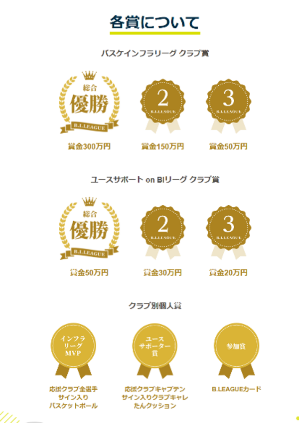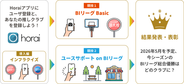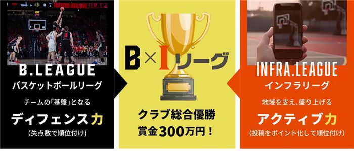 バスケインフラリーグ(通称 BIリーグ)は、クラブとファン・市民が一体となって地域を支え盛り上げるための参加型ゲームです。バスケットボールリーグとインフラリーグの2部門の順位を合計して総合優勝クラブを決定、優勝賞金300万円がクラブに進呈されます。