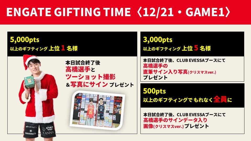 ①5,000PTS相当以上のデジタルギフトをギフティングいただいた方の中から「上位1名さま」へ【12/21(日)試合後のセレモニーにて、高橋 快成選手と2ショット撮影&直筆サイン入り2ショット写真プレゼント】